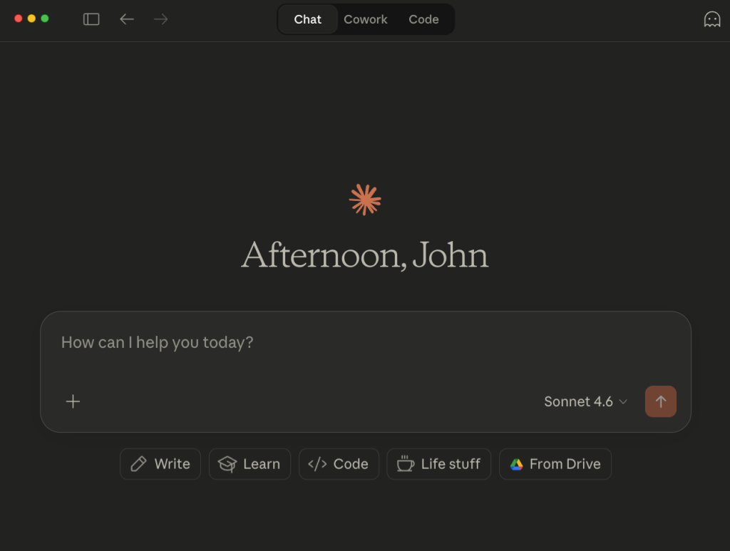 Cowork runs inside the Claude desktop app (macOS or Windows, no mobile). When you open the app, you’ll see two tabs at the top: “Chat” and “Cowork.”