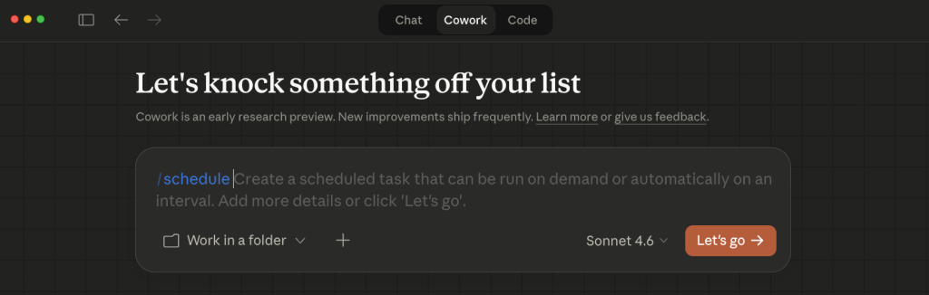The easiest: type /schedule inside any Cowork task. A setup wizard launches and walks you through a few questions, usually with multiple-choice options, so you’re not guessing what to type.
